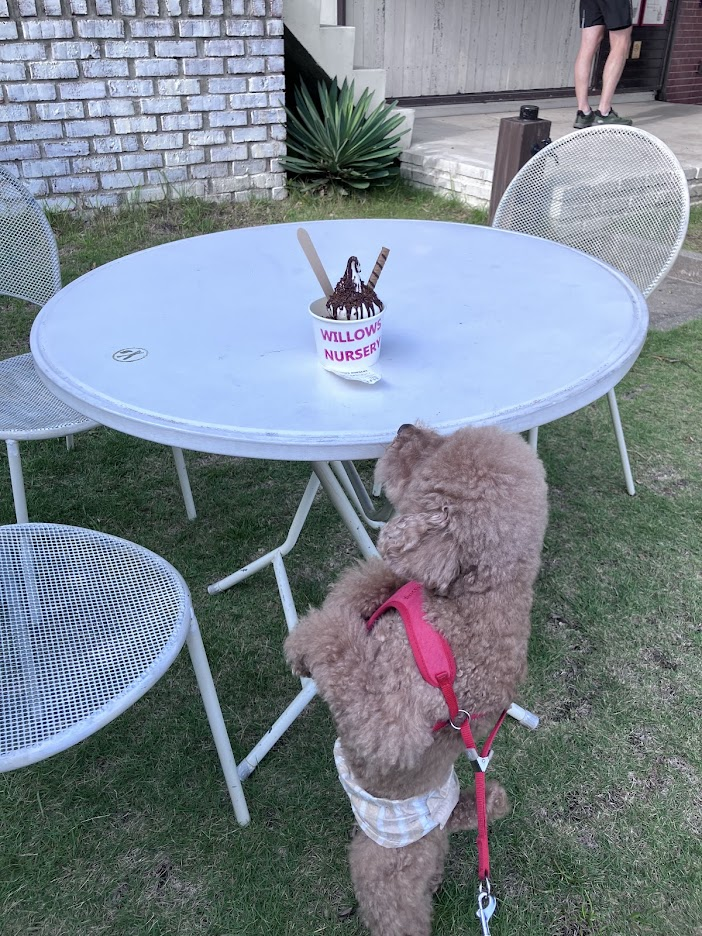 パリパリチョコソフトを注文。結構、ボリュームあります。パリパリチョコとナッツが美味しかった!頑張って背伸びしたけど食べれないワンコwww