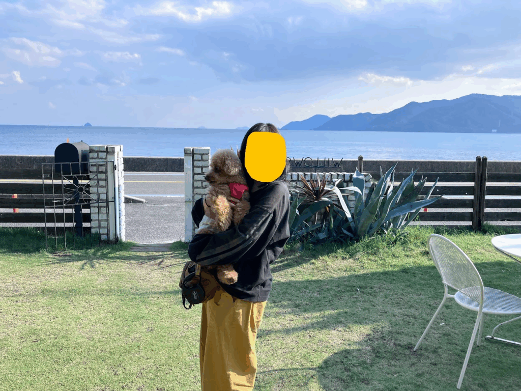 目の前は、因島。綺麗な海と青い空。可愛いオチリ💖