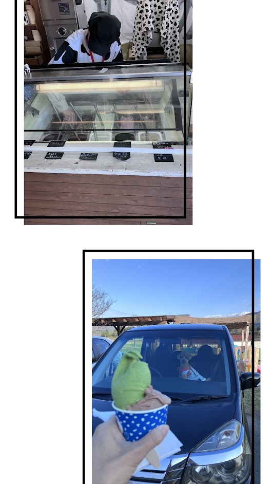 トム名物のジェラート。抹茶と、ショコラオレンジをカップで。ワンコは店内NGなんで車で待機。ショコラオレンジはオレンジピールも入ってて美味しかった!